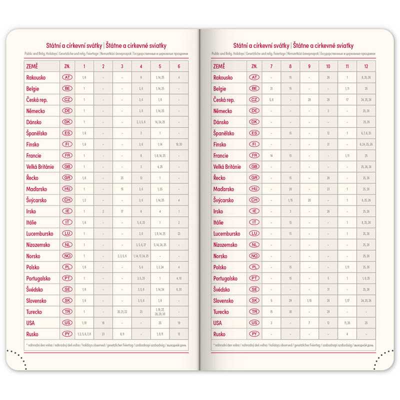 Nový rad diárov s výrazným letopočtom. Povrch má jemnú štruktúru a je vhodný pre všetky typy razieb. Týždenné rozloženie s česko-slovenským kalendáriom a doplnkovou angličtinou, nemčinou, maďarčinou a ruštinou.• kalendárium od decembra 2025 • ročný plánovací kalendár 2026–2027 • pracovný plánovací kalendár • sviatky Českej a Slovenskej republiky a medzinárodné sviatky • rozšírený zoznam českých mien • miesto pre osobné údaje • perforované rožky• priestor pre poznámkyRozsah: 128 strán. Rozmer: 9 x 15,5 x 1 cm. Hmotnosť: 0,08. Papier: 70 g/m2 krémový papier. Väzba: tuhá knižná. Kalendárium: 6 jazyčné (CZ, SK, GB, DE, HU, RU) .