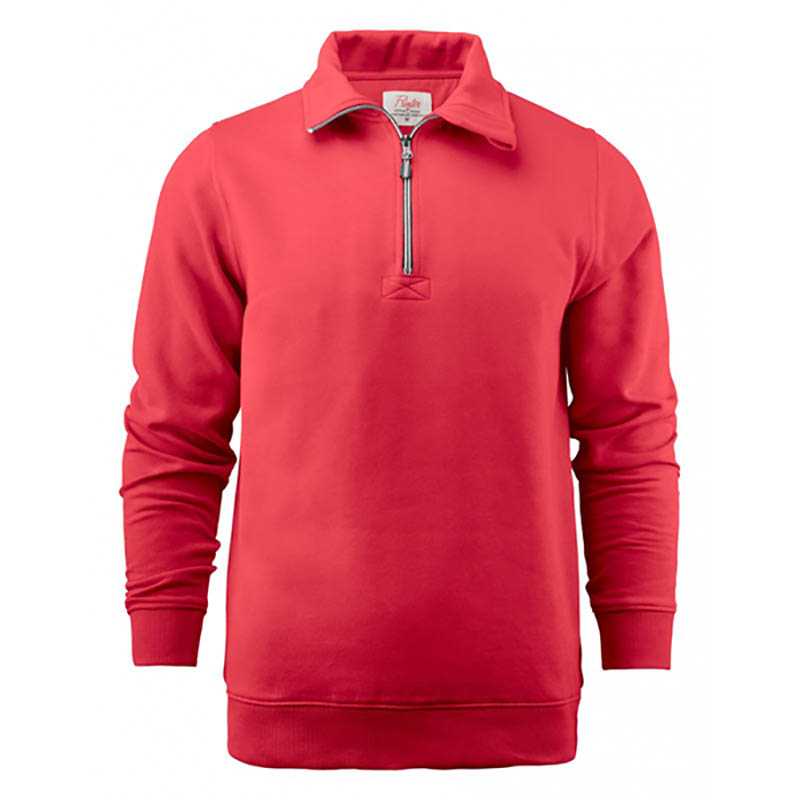 Sweatshirt with collar halfzip. 2x2 rib ending at sleeves and bottom hem. Material: 60% Poliester, 40% Cotton Colors: 400 red, 600 navy, 632 ocean blue, 728 fresh green, 900 black, 935 steel grey, 100 white, 120 grey melange Size: XS–5XL