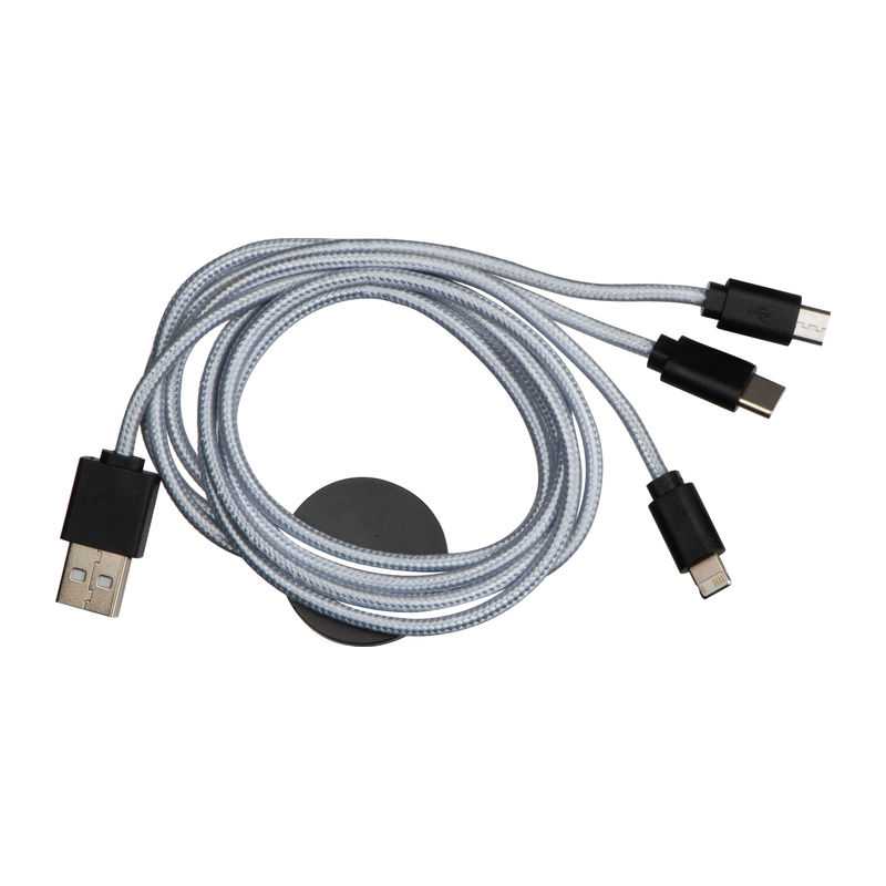 Charging cable MAG POWER: for charging of electronic devices, incl. 3 adapters (USB Type-C, Micro-USB, and Lightning), length approx. 100 cm, the adapter is plugged into the device that needs to be charged and remains there, while the connection to the ca