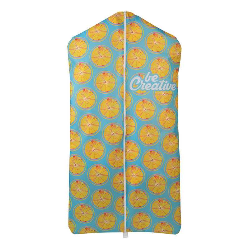Na zákazku vyrobená taška na odevy na zips z polyesteru 190T RPET. S celoplošne tlačenou sublimačnou grafikou a výrazným štítkom RPET. MOQ: 50 ks.