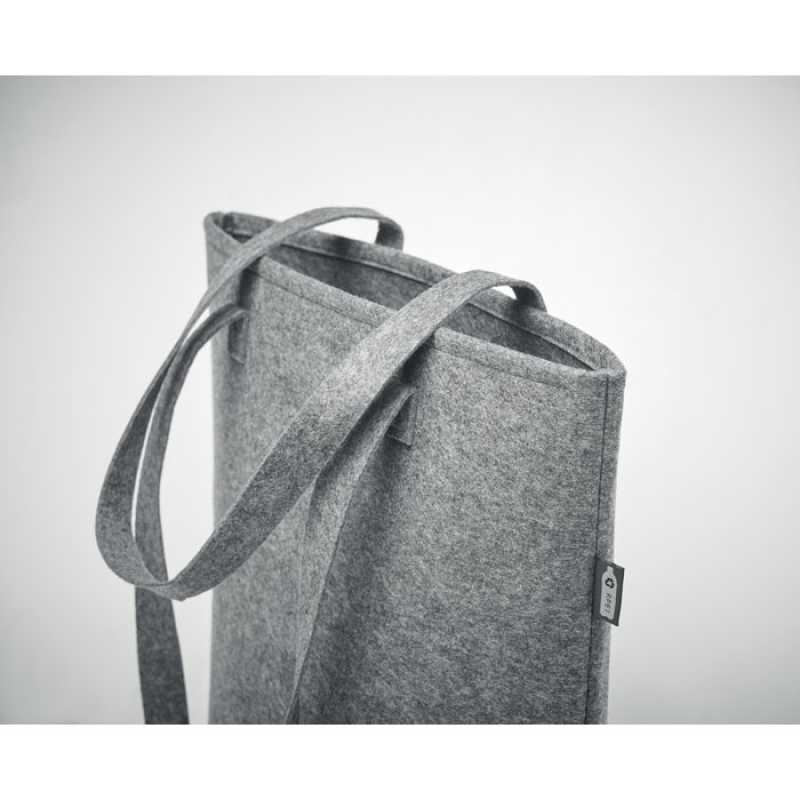 Plstěná nákupní taška z RPETu s dlouhými držadly a složeným dnem. Tloušťka plsti: 2 mm.