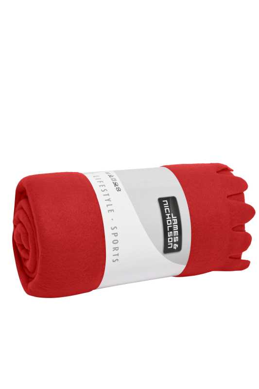Flísová deka z polyesteru 180 g/m2, strojovo šitá, vybavená popruhom na nosenie. Rozmery rozloženej deky: 120 x 150 cm.