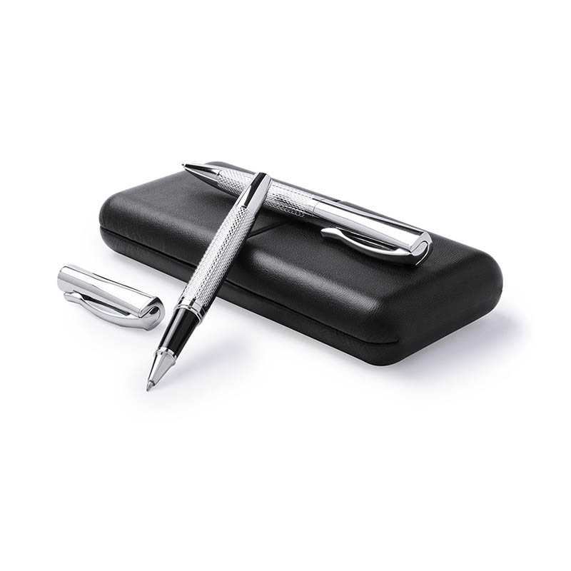 NOVINKA 2025. Elegant set of ball pen with twist mechanism and hooded roller hood in sober design. Non-slip metal body in shiny silver finish with matching color clip. Presented in an elegant and original individual black PU leather case with a die-cut inside in soft white velvet. Jumbo cartridge with German quality blue ink.