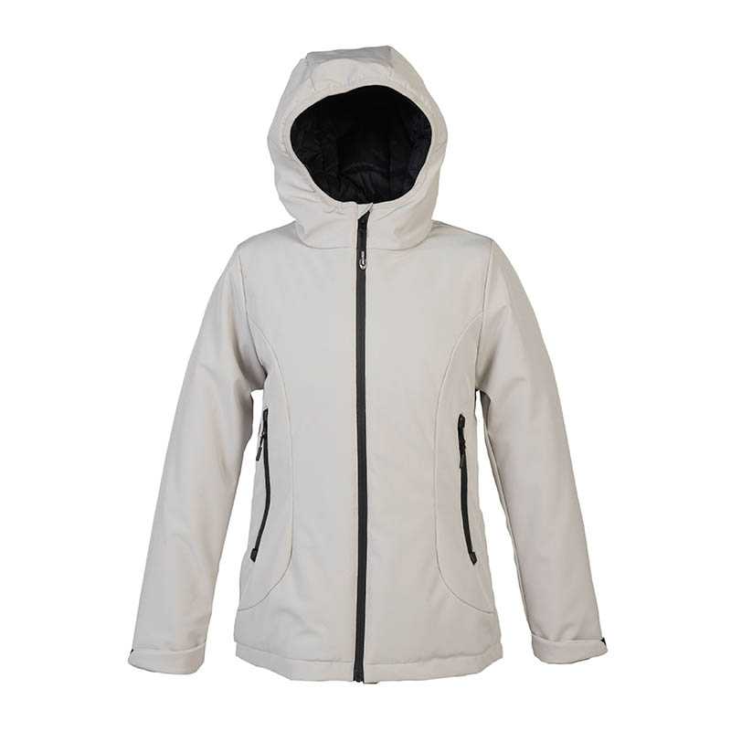 Waterproof stretch fabric jacket - 94% polyester - 6% elastane with TPU membrane - Water resistance 4000 mm/H2O - Breathability 1000 g/M2/24h - Soft polyester padding (feather effect) - 320T soft polyester lining - Padded hood - Laser cut waterproof zippers - Two large external zip pockets - One interior wallet pocket with zip - Adjustable velcro closure cuffs - Stretch wind resistant fabric on the inside of the cuffs