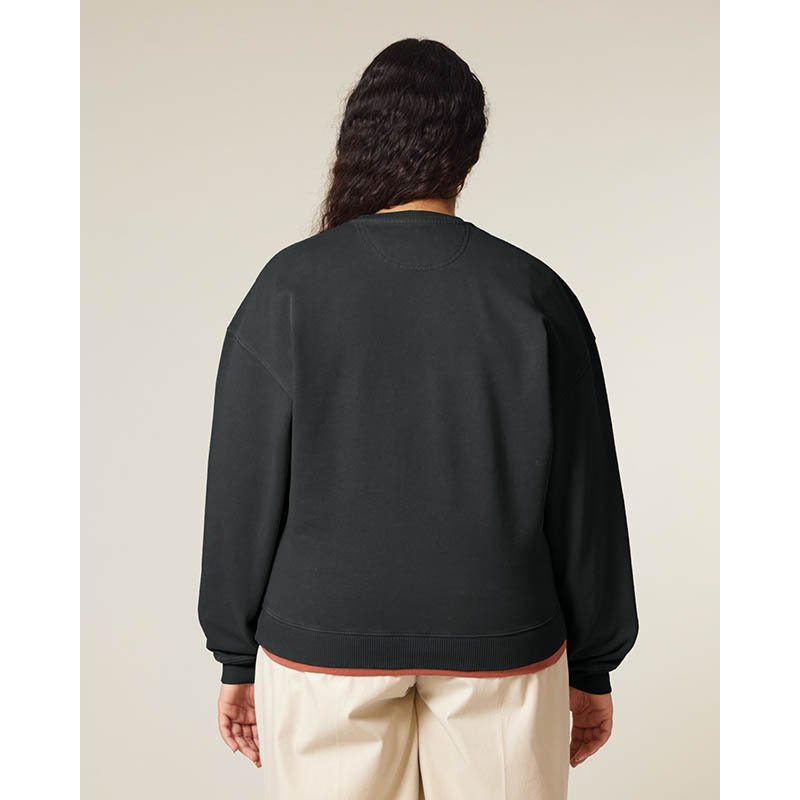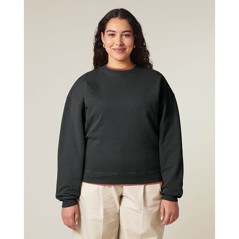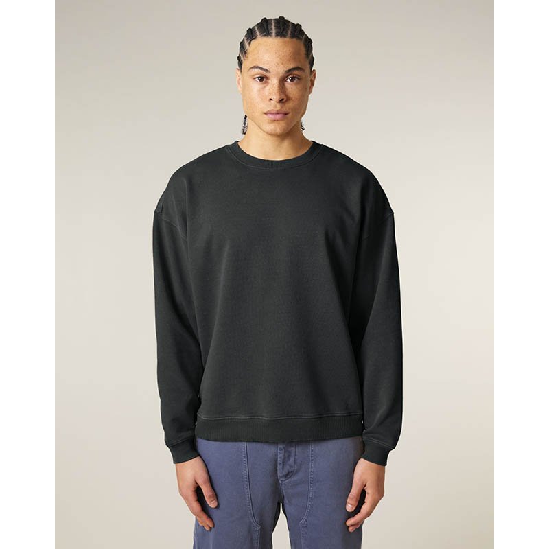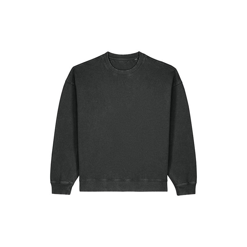 NOVINKA 2024. Relaxed fit crewneck sweater with dropped shoulders. Wide rib endings at sleeve and bottom hem. Colors: 120 grey melange, 484 dusty red, 514 summer blue, 600 navy, 784 aloe green, 900 black 85% Organic Cotton, 15% Recycled Polyester 350 g/m2 Oeko-Tex, OCS, GRS certified