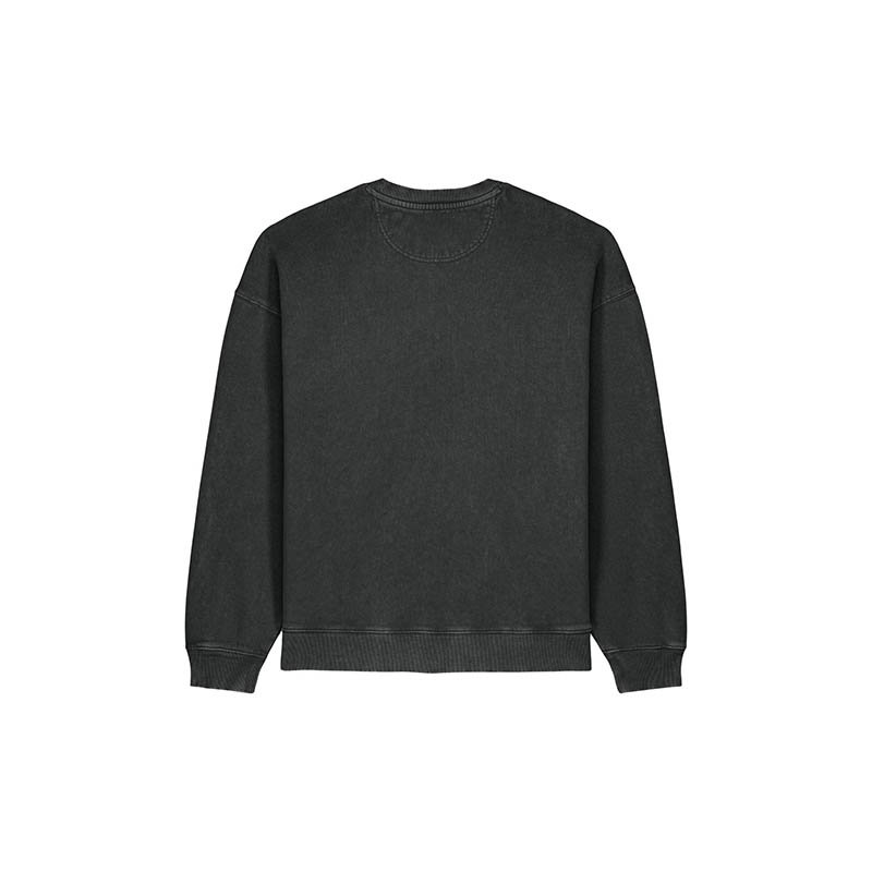NOVINKA 2025. Set-in sleeves 2x1 Rib at collar, sleeve cuffs and bottom hem Double needles topstitches on all seams Inside herringbone back neck tape Self fabric half moon at back neck Slight shading on seams to give washed look. Garment dyed product, eac