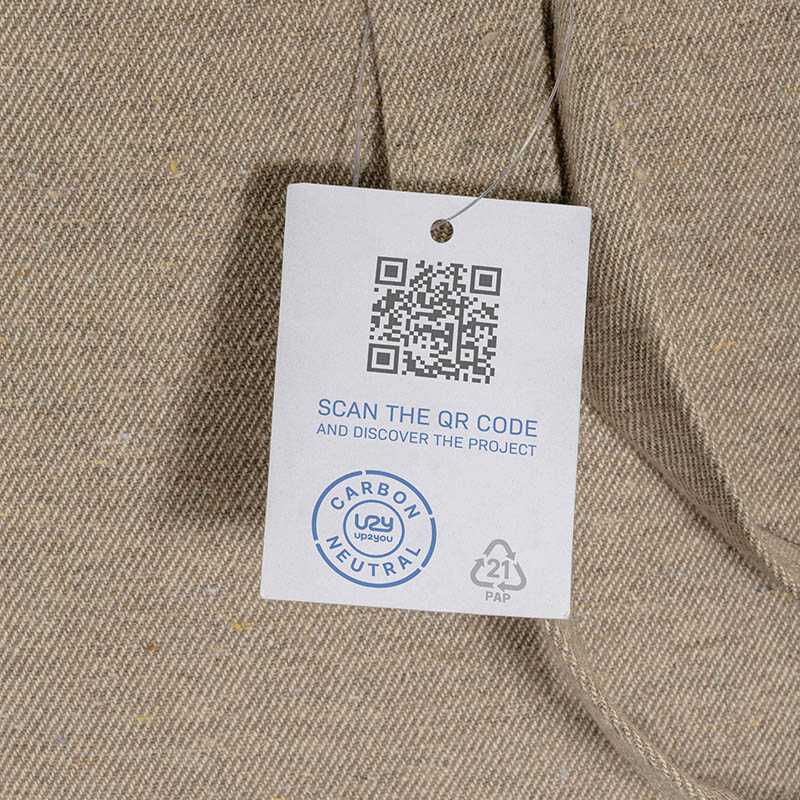 Přední kapsa z nelaminované škrobené juty / bavlněného plátna (340 g/m2) . Bavlněná ucha na přenášení (55 cm) . Štítek k odstřihnutí . Objem: 21 litrů