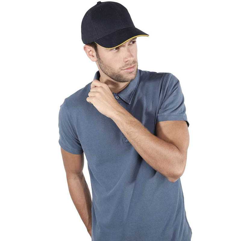100 % ťažký kartáčovaný bavlnený keper.Kontrastný sendvičový šilt.Nastavenie veľkosti pomocou kovovej pracky a pútka.*3 farebné prevedenia s dodatočným kontrastom pod šiltom.Certifikát STANDARD 100 podľa OEKO-TEX®N° CQ1007/8, IFTH.