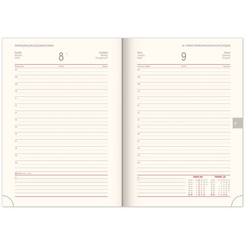 a Slovenskej republiky• mapa Českej a Slovenskej republiky • miesto pre osobné údaje • textilná záložka • perforované rožky • priestor na poznámkyRozsah: 352 strán. Rozmer: 15 x 21 x 3 cm. Hmotnosť: 0,38. Papier: 70 g/m2 krémový papier. Väzba: tuhá knižná. Kalendárium: 6 jazyčné (CZ, SK, GB, DE, HU, RU) .