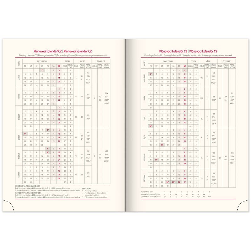 Nový rad diárov s výrazným letopočtom. Povrch má jemnú štruktúru a je vhodný pre všetky typy razieb. Denné rozloženie s česko-slovenským kalendáriom a doplnkovou angličtinou, nemčinou, maďarčinou a ruštinou.• kalendárium od decembra 2025• mesačný plánovací kalendár 2026 • mesačný plánovací kalendár 2027• ročný plánovací kalendár 2026–2027 • pracovný plánovací kalendár • sviatky Českej a Slovenskej republiky a