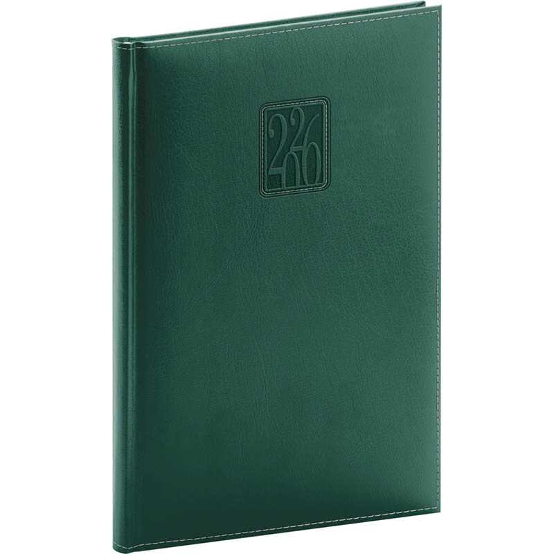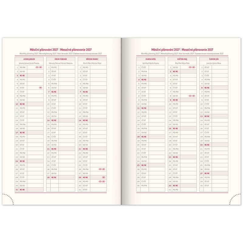 Nový rad diárov s výrazným letopočtom. Povrch má jemnú štruktúru a je vhodný pre všetky typy razieb. Týždenné rozloženie s česko-slovenským kalendáriom a doplnkovou angličtinou, nemčinou, maďarčinou a ruštinou.• kalendárium od decembra 2025• mesačný plánovací kalendár 2026 • mesačný plánovací kalendár 2027• ročný plánovací kalendár 2026–2027 • pracovný plánovací kalendár • sviatky Českej a Slovenskej republiky a zahraničné sviatky
