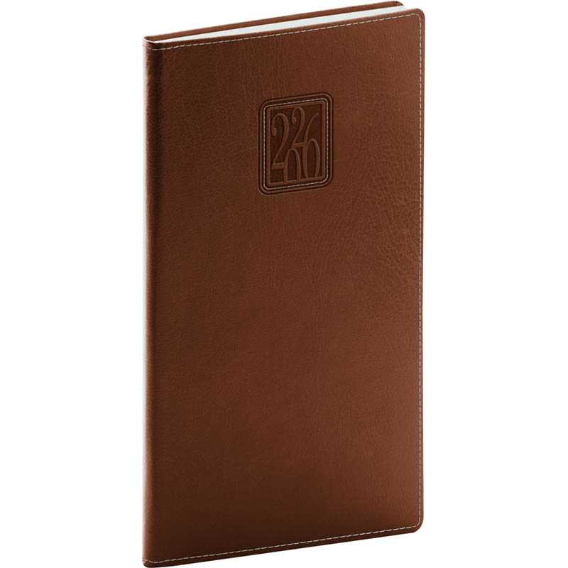 Vreckový diár Tomy 2026 v hnedo-červenej farbe. Klasický povrch imitujúci kožu, ktorý dopĺňa jemné prešitie. Na materiál je možné tlačiť a je vhodný pre všetky typy razieb. Týždenný rozvrh s česko-slovenským kalendáriom a doplnkovou angličtinou, nemčinou, maďarčinou a ruštinou.• kalendárium od decembra 2025 • ročný plánovací kalendár 2026–2027 • pracovný plánovací kalendár • sviatky Českej a Slovenskej republiky a medzinárodné sviatky • rozšírený zoznam českých mien • miesto pre osobné údaje • perforované rožkyRozsah: 128 strán. Rozmer: 9 x 15,5 x 1 cm. Hmotnosť: 0,08. Papier: 70 g/m2. Väzba: tuhá knižná s pútkom na ceruzku. Kalendárium: 6 jazyčné (CZ, SK, GB, DE, HU, RU) .