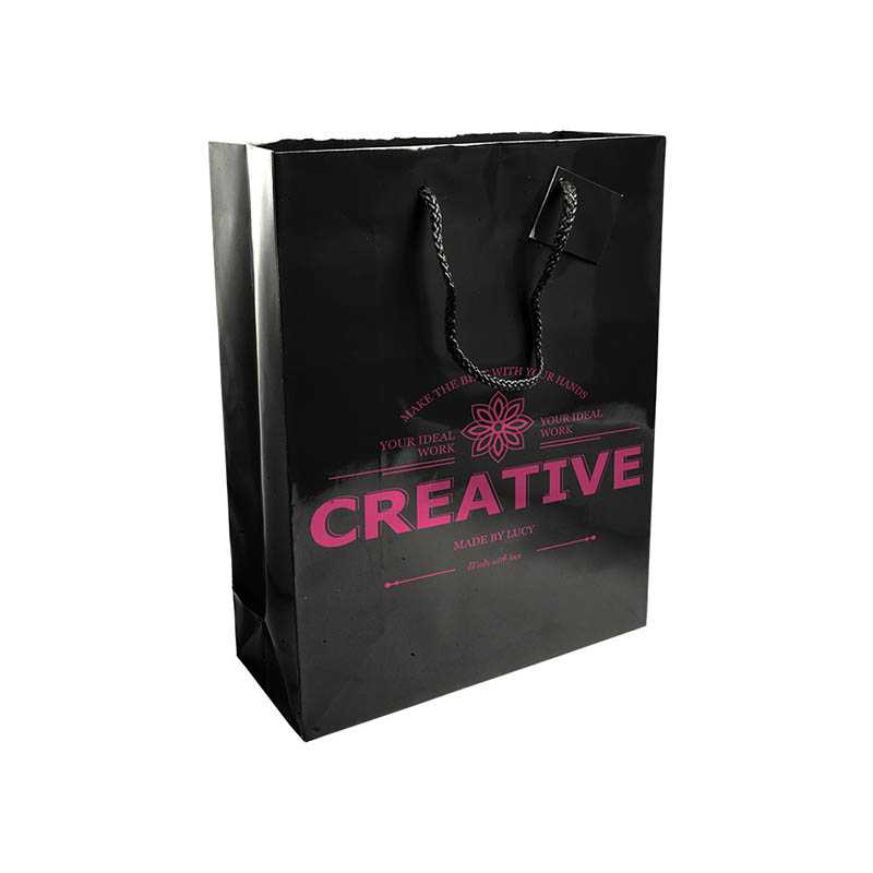 157 g/m2 laminated paper shopping bag with gusset and bottom reinforcement, string handles and greeting tag