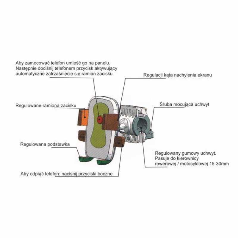Držiak mobilného telefónu na bicykel z plastu a gumy pre mobily so šírkou 5,5 - 8,5 cm. Nastaviteľný sklon. Vďaka spôsobu uchytenia môžete telefón upevniť alebo uvolniť len jednou rukou.