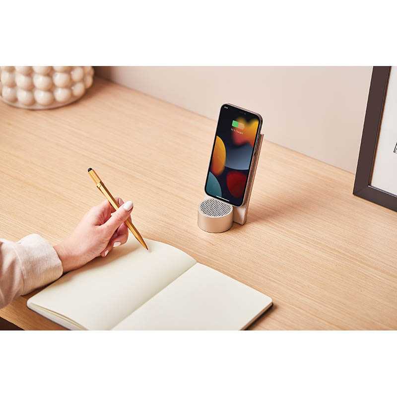 Wireless charging station with Bluetooth® speaker & Microphones - 10W Qi wireless charging station - 5W Bluetooth® speaker - Compatible with Qi-enabled devices - Hands-free conference calls - Environment noise-cancelling microphones - Wireless charging &