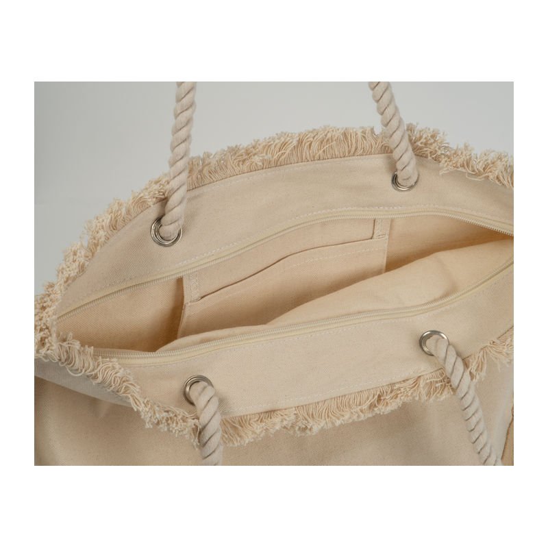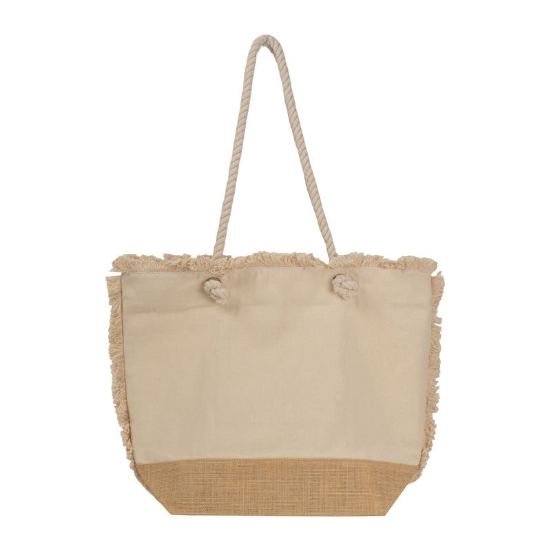 Oeko-Tex® plážová taška 320g/m2 zo štruktúrovaného bavlneného materiálu prírodnej farby s jutovým dnom a šnúrovanými ušami. Ideálna na pláž alebo do bazéna.