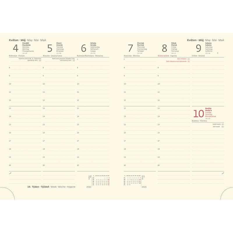 Nový rad diárov v modernom dizajne doplnenom o pevnú gumičku a pútko na pero. Týždenné rozloženie s česko-slovenským kalendáriom a doplnkovou angličtinou, nemčinou, maďarčinou a ruštinou.• kalendárium od decembra 2025• mesačný plánovací kalendár 2026 • mesačný plánovací kalendár 2027• ročný plánovací kalendár 2026–2027 • pracovný plánovací kalendár • sviatky Českej a Slovenskej republiky a zahraničné sviatky• mapa Českej a Slovenskej republiky • miesto pre osobné údaje • textilná záložka • perforované rožky • priestor na poznámkyRozsah: 144 strán. Rozmer: 15 x 21 x 2 cm. Hmotnosť: 0,28. Papier: 90 g/m2 krémový papier. Väzba: tuhá knižná s gumičkou a pútkom na ceruzku. Kalendárium: 6 jazyčné (CZ, SK, GB, DE, HU, RU) .