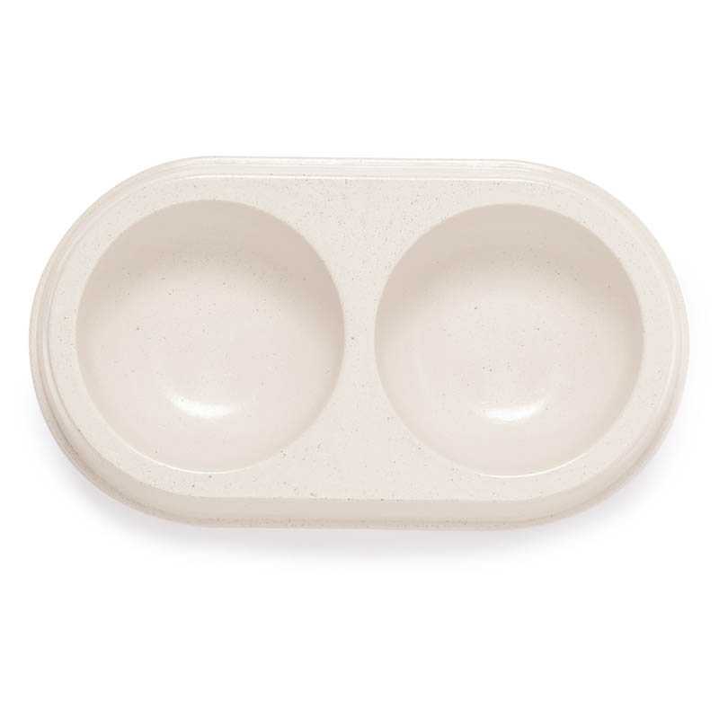 NOVINKA 2025. Double compartment pet bowl made of bamboo fibre. Ideal for feeding pets and with two compartments, one for solids and one for liquids. Presented in an individual recycled bag.Materials such as bamboo promote the use of natural raw materials, thus reducing pollutant emissions. It comes from a highly resistant and versatile plant, with rapid growth and regeneration, making it an excellent alternative to the use of traditional wood.