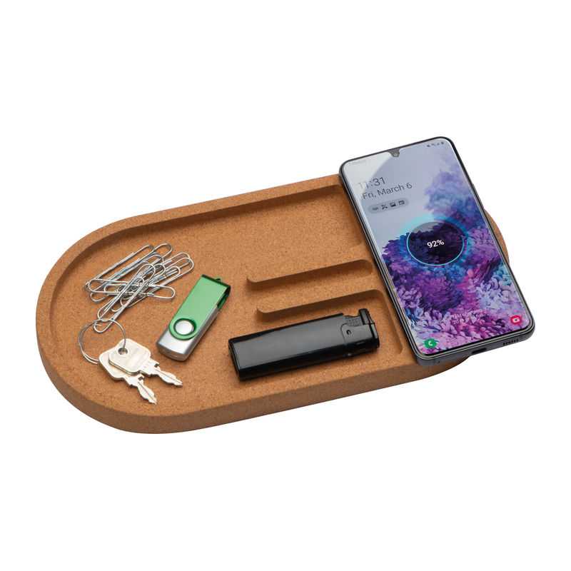 Stolný organizér vyrobený z bambusu a korku s držiakom na mobil, 10W indukčná nabíjačka.