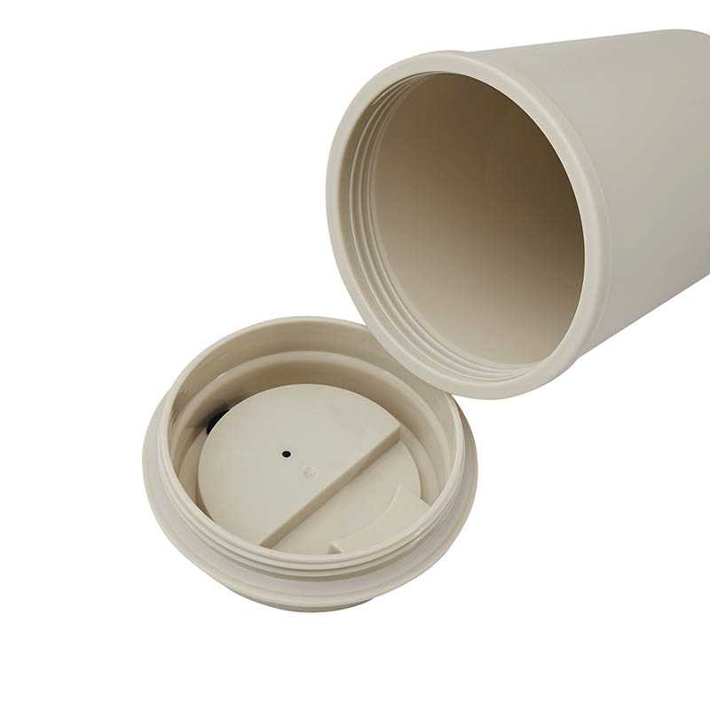 Dvojstenný plastový termo hrnček na zákazku s viečkom na pitie a so silikónovým úchopom, 400 ml. Min. mn. 50 ks.