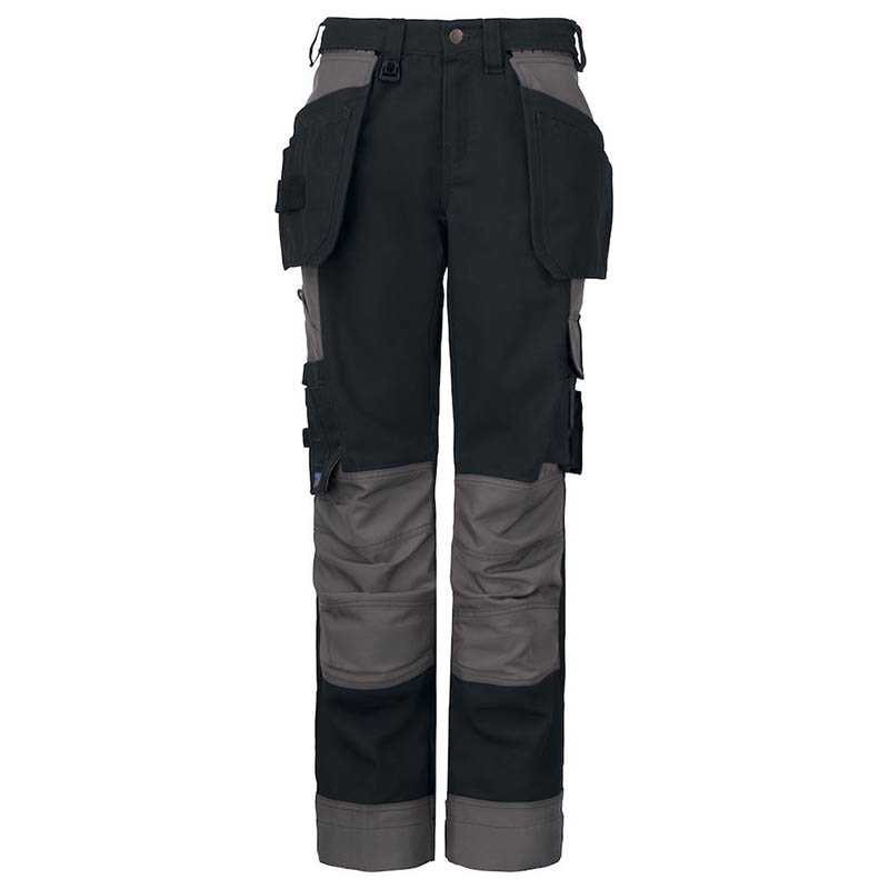 Product Fabrics: 100% cotton 375 g/m2, reinforcements in 100% polyamide, Cordura® Description: Ladies waistpant with two two detachable holster pocketsy one with extra pocket and one with tool loop. The nail pockets are reinforced in 100% Cordura®. Leg pockets with slots for your mobile phone, pens and tools. Two adjustable hammer loops. Two D-rings. Rule pocket with tool pocket and knife button. Cordura® knee pockets that open from the inside and height adjustable knee pads. Pre-bent knees. Oversized back pockets. Left back pocket with lid. Back and leg pockets have loops. Fastening for ID card holder.