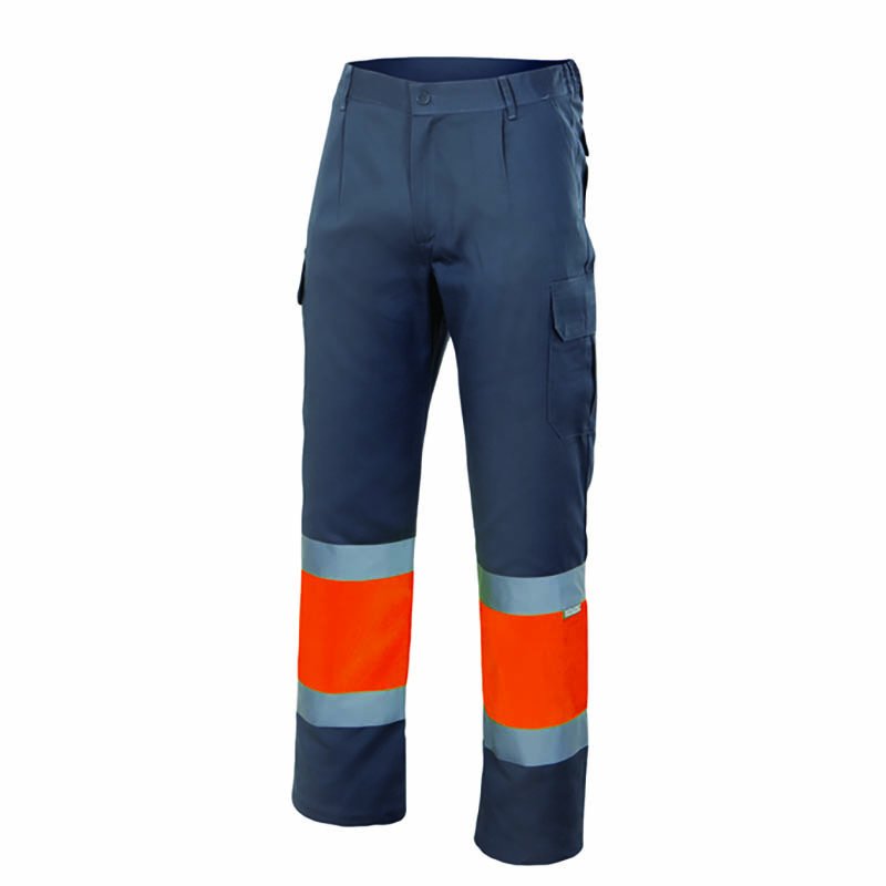 High Visibility Two-Tone Multi-Pocket Trousers. Made of complex bi-stretch fabric that provides mobility, with a repellent finish for added comfort, includes two sewn reflective tapes on leg cuffs to enhance user visibility. Garment certified as a High Visibility Category II PPE based on 13688 and 20471 standards, Class 1.Back and sides elasticated waistband for a better fitting, double main seams and extra high-wear reinforcements with safety bartacks, ensuring long-lasting strength and durability.Two slanted hip pockets, two gusseted side pockets and two back pockets, all four with velcro flap closure and a two-tone reflective puller for easy opening and a secure and convenient storage.uitable marking methods: embroidery, stitching and anti-sublimation heat-stickers. Ideal as workwear and uniforms.