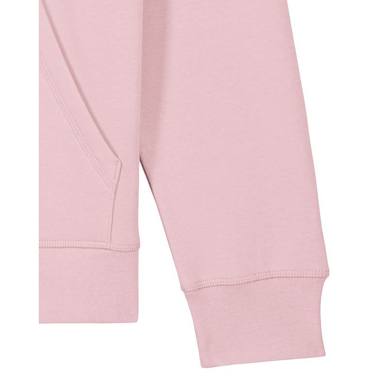 Kvalita.80 % organicky pestovaná bavlna – 20 % recyklovaný polyester.3 priadze .Kartáčovaná podšívka.Zvonku: 100 % organická bavlna.Štýl.Strihané a šité.Raglánové rukávy.2 x 2 rebrované manžety a spodný okraj.Polmesiac vnútri goliera.Páska na krku.Sťahovacia šnúrka s kovovými očkami a zátkami.Kapucňa s podšívkou z džerseja.