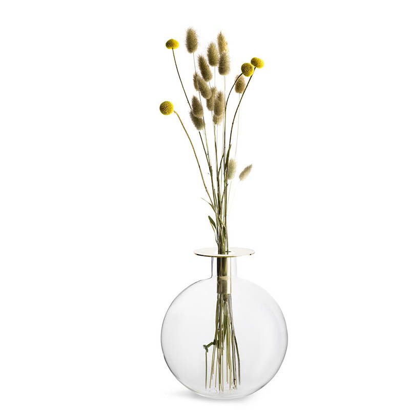 Product Number: 5017869 Product Fabrics: Metal/Mouth-blown glass. Description: Hold is a unique glass vase designed by Pascal Charmolu. Its length can be adjusted by moving the gold-coloured metal holder up or down, so you can support tall flowers with style.