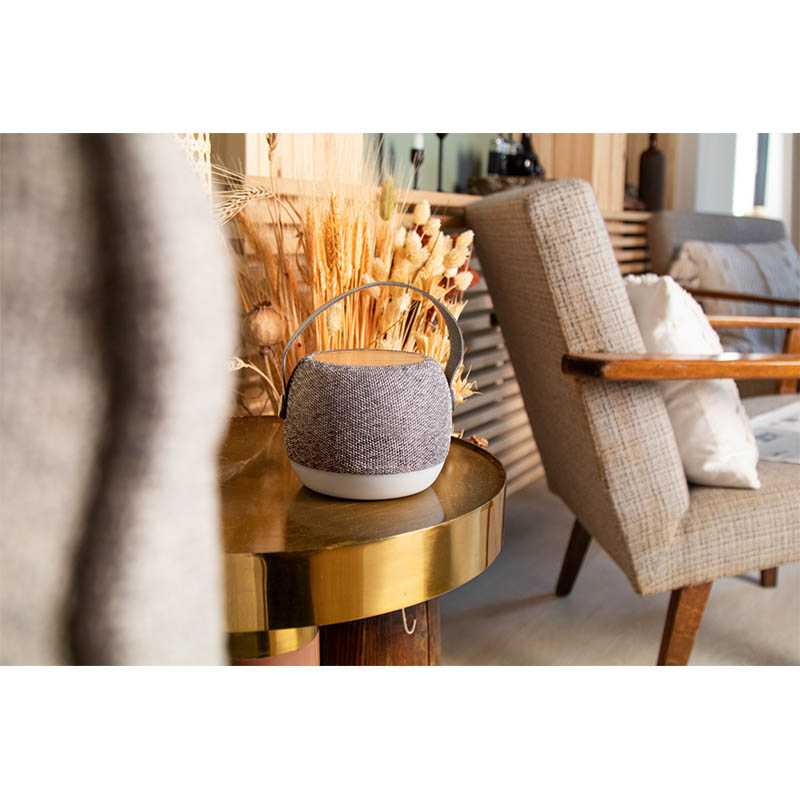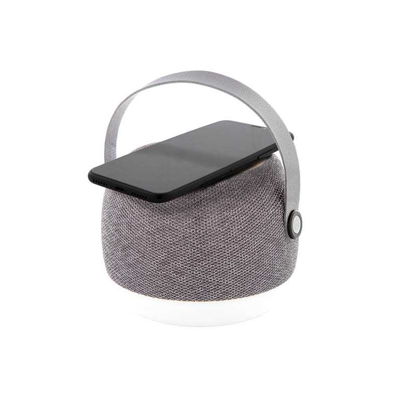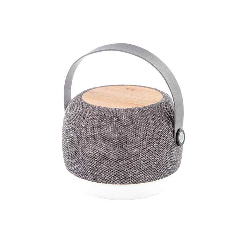 Bluetooth reproduktor v puzdre z recyklovaného ABS potiahnutého látkou RPET s LED svetlom v spodnej časti a bezdrôtovou rýchlonabíjačkou z bambusovej dosky (15W) hore. S popruhom na prenášanie z PU kože, funkciou hands-free volania a vstavanou dobíjacou b
