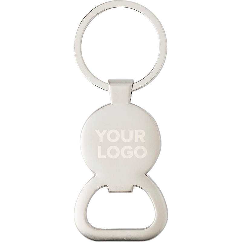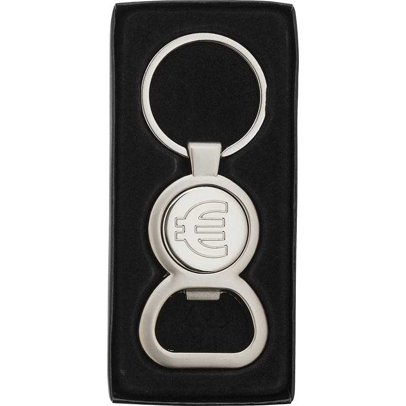 Metal key holder with a bottle opener and an inlayed magnetic “euro” shopping cart coin. Packaged in gift box.