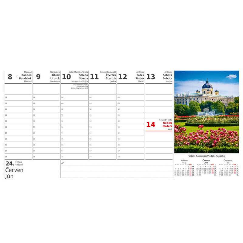Kalendár Mestá Európy 2026. Formát kalendára: 30,1 x 15 cm. Kalendárium: české/slovenské týždenné stľpcové. Počet strán kalendára: 60 + 2. Stojanček: s plným dnom. Priestor na potlač: 30,1 x 3,5 cm. + ročné obdobia, 3mesačný prehľad