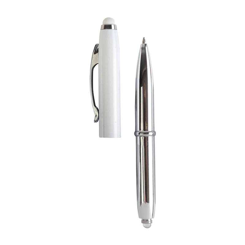 Mini silver plastic pen with metal lid and clip, light and touchscreen rubber tip