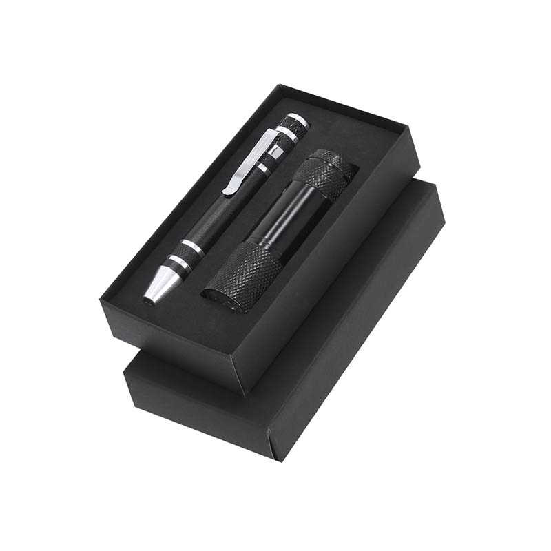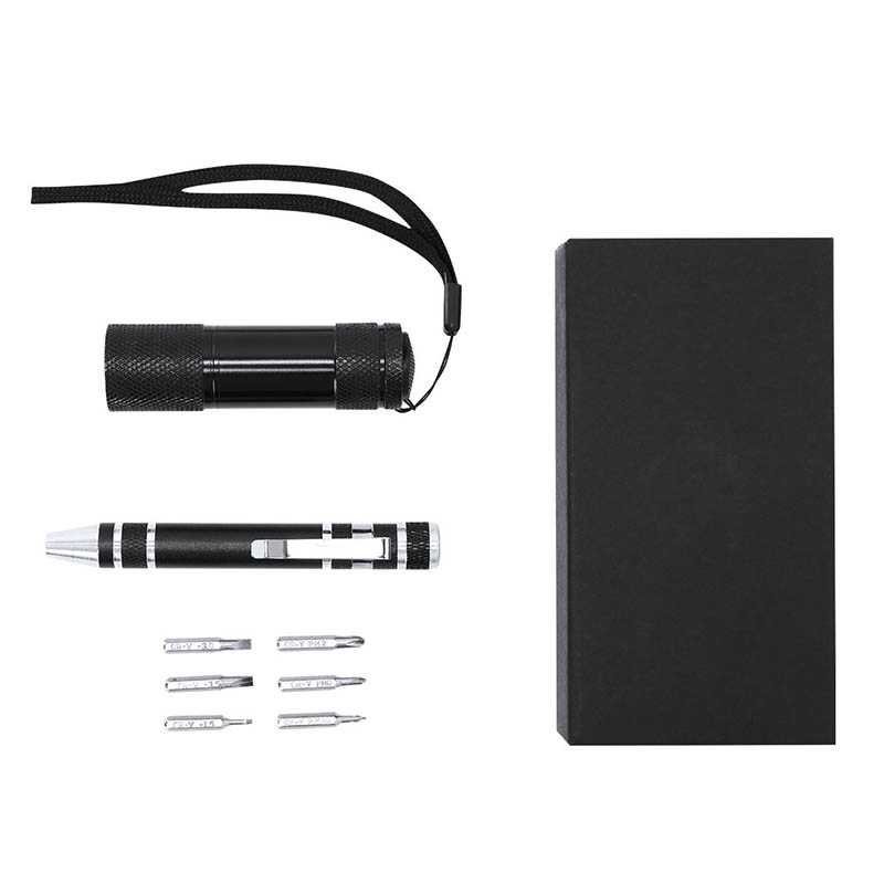 NOVINKA 2025. Multifunctional Tool Set with Flashlight and Aluminum Screwdriver. Includes:- Screwdriver with 6 magnetic heads: 3 flat and 3 star, equipped with a practical metal clip for easy attachment and transport.- LED flashlight with 9 LEDs, powered by 3 AAA batteries (not included). Includes a wrist cord for comfort and safety during use.Presented in a black box.