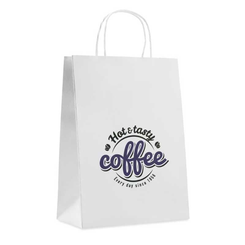 Matná laminovaná papierová darčeková taška s vianočným dizajnom, s bielou plochou a visačkou.