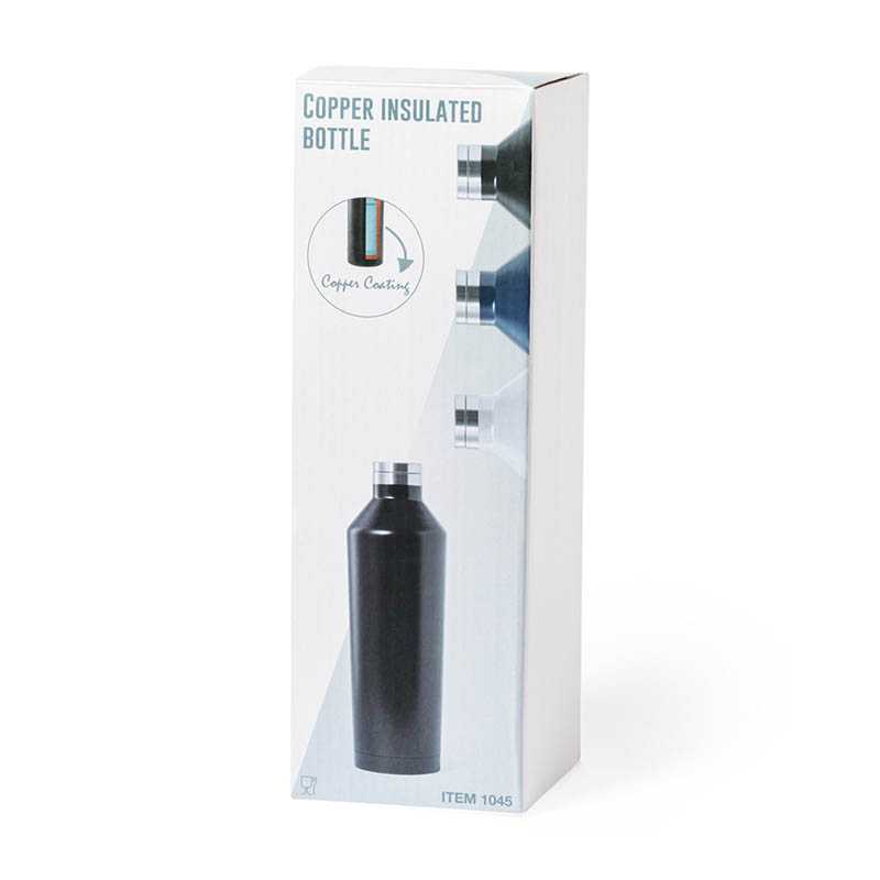 NOVINKA 2025. 550 ml capacity thermal bottle, made in double wall stainless steel. With screw cap, BPA free and available in a wide range of satin colours. Presented in an individual box with kraft design.Instruction manual available in Spanish and English.