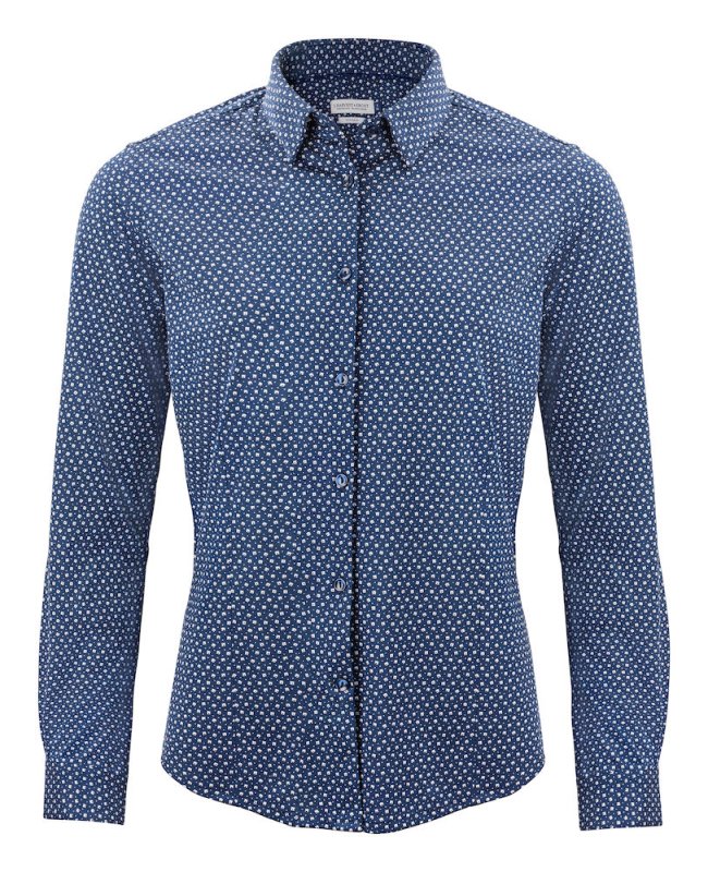 Product Name: Red Bow 120 Woman Product Number: 2912003 Product Fabrics: 100% twill cotton, long staple 2-ply. Compact cotton. Non-iron. Description: The perfect shirt for any occasion. With the characteristic indigo color, our famous non-iron fine twill fabric can remind you of a smart “jeans shirt”. It is set up with a tone in tone paisley contrast pattern in collar & cuff, and white details in placket & button tread. The typical Redbow line-shirt. Classical, yet detailed, giving the shirt a modern sophisticated look. Woman fit. • Red bow line. • Machine washable. • Non-iron patented environmental treatment. • Split back yoke ensures smooth contoured shoulders, and a greater range of motion. • Taped main-seams help the shirt look sharp and neat wash after wash. No wrinkles. • Semi cut away collar. • Long sleeve. Single angel-cuff, with extra buttonhole for cufflinks. • Tall, 4 mm-thick buttons give a substantial and modern feeling. • Curved hem.