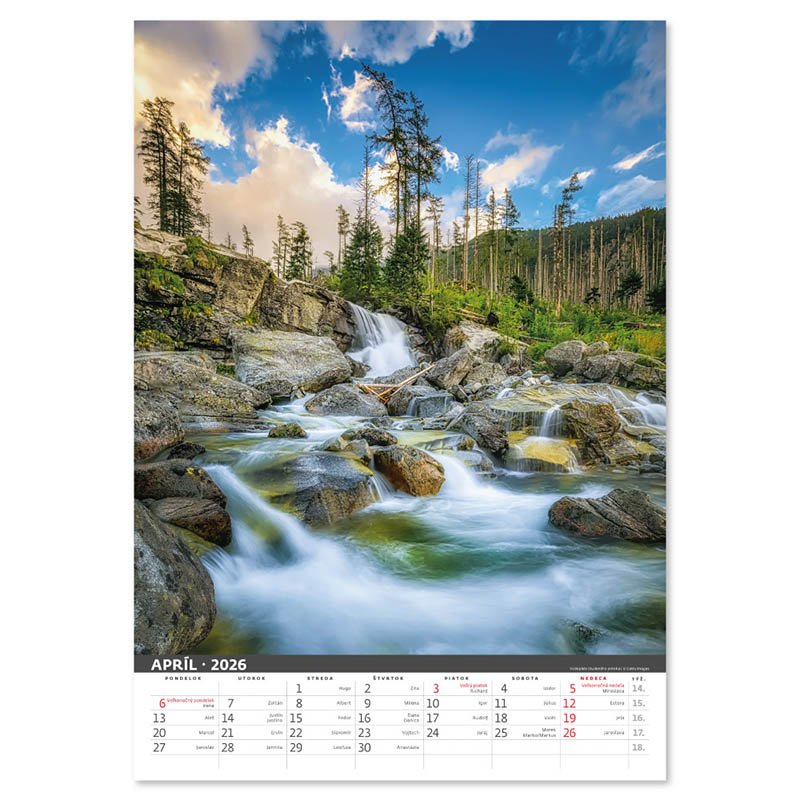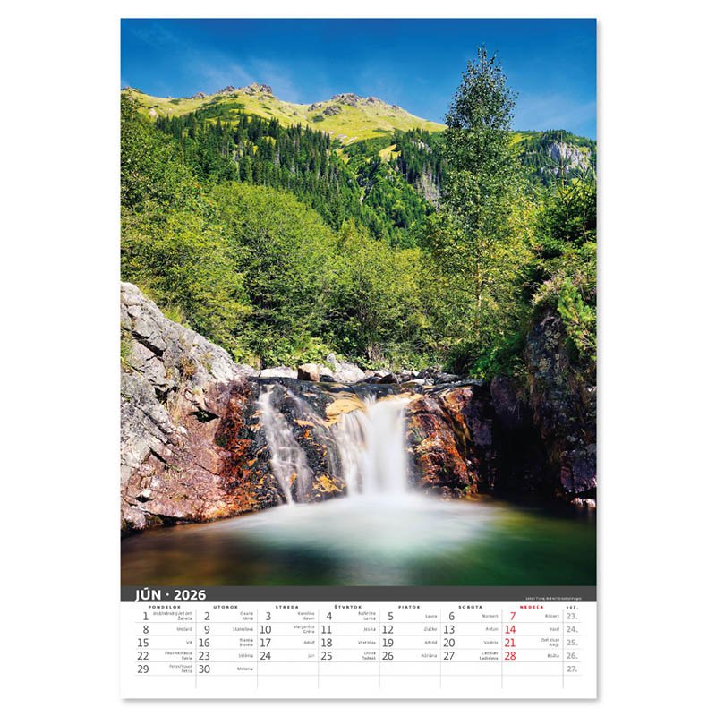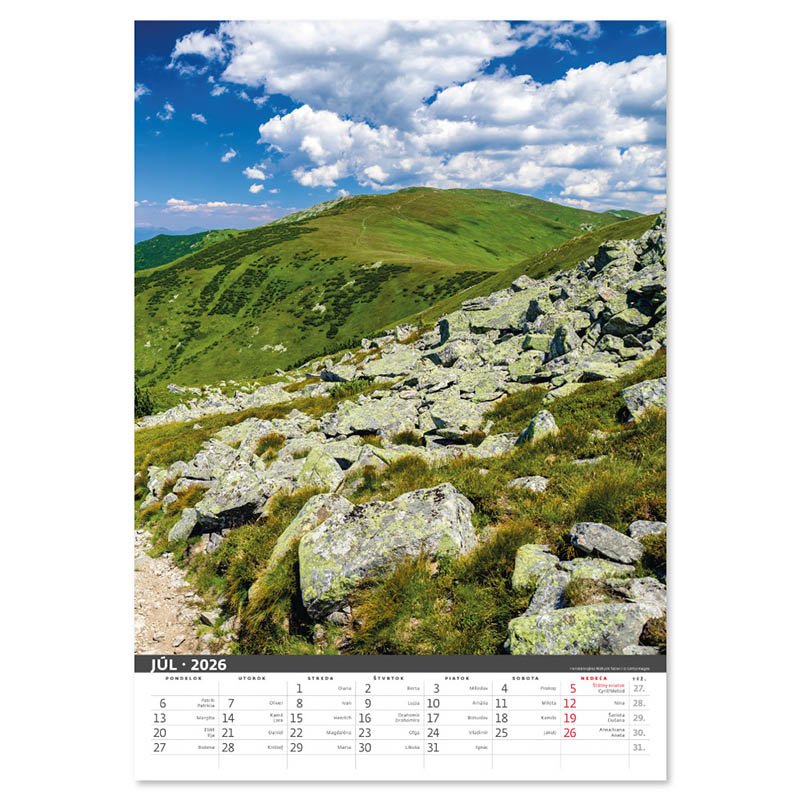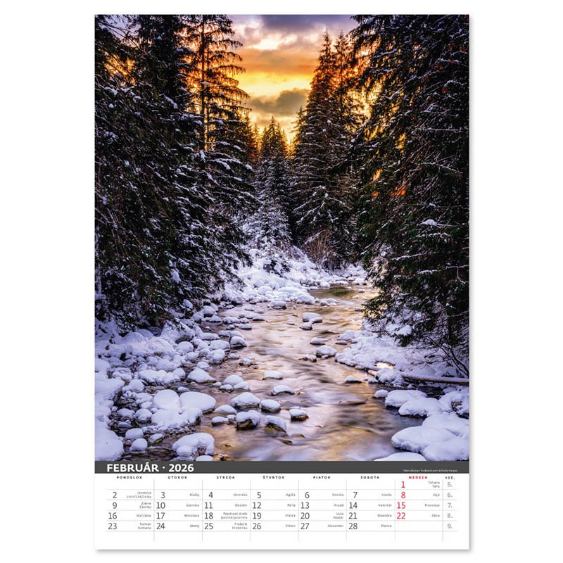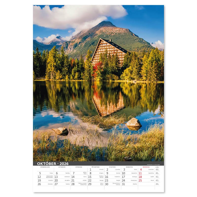 Kalendár Slovenská krajina 2026. Formát kalendára: 31,5 x 45 cm . Kalendárium: slovenské trojmesačné menné . Rozsah kalendára: 14 listov . Twinová väzba . Priestor na potlač: 31,5 x 7 cm