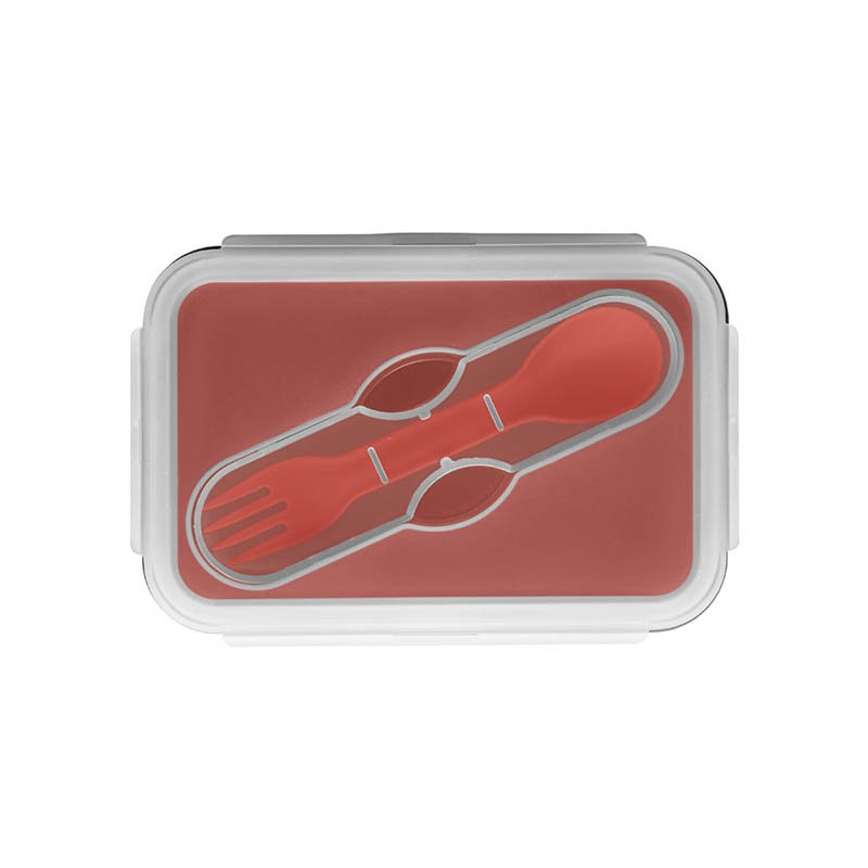 Zaťahovacia uzatvárateľná krabička zo silikónu a PP s priehradkou. Objem je až 640 ml. V hornej časti viečka je priestor pre uloženie jedného kusu príbora. Súčasťou balenia je vidlička a nôž v jednom. Vhodné pre použitie v mikrovlnnej rúre (musí byť odstránený kryt). 160 x 110 x 66 mm | Zložené: 160 x 110 x 40 mm