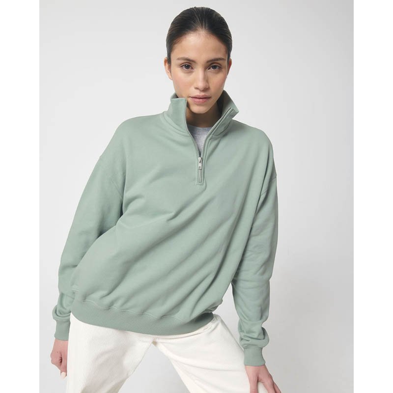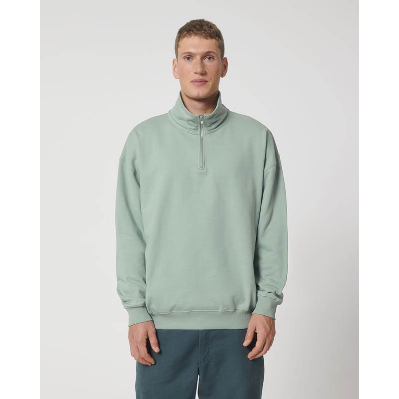 Mikina na polovičný zips s česanou podšívkou v unisex veľkostiach. Dve predné vrecká, 2x2 rebrovanie na okraji rukáva a spodnom leme. Moderný strih. Materiál: 80% organická bavlna 20% recyklovaný polyester. Gramáž: 280 g/m2. Certifikáty: GOTS, Fairtrade Cotton, Nordic Swan Ecolabel, Oeko-Tex