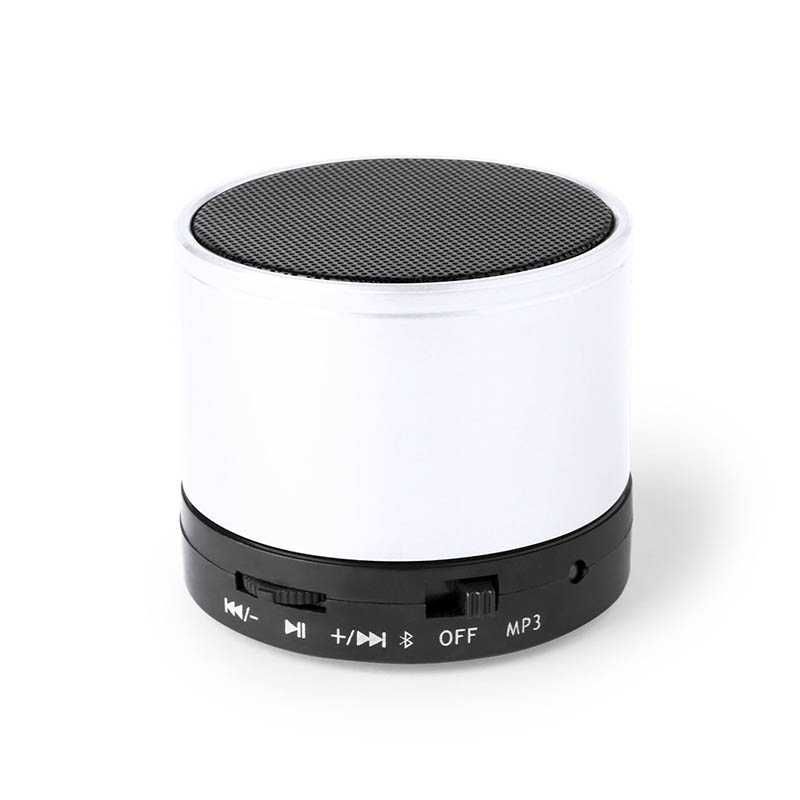 NOVINKA 2025. Compact speaker with Bluetooth® 5.0 connection AND 3W power. Hands-free function, slot for mini SD cards up to 64 GB capacity, FM radio function, and Aux-in via 3.5 mm jack connection. With non-slip rubber pads on the base. Compatible with iOS and Android, includes charging cable and 3.5mm jack AUX cable. Presented in an attractive design box, with instruction manual in English and Spanish. Available in a wide range of metallic colours.