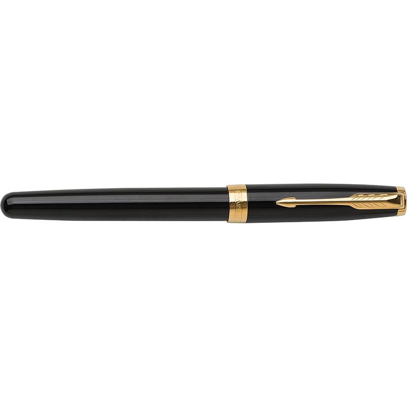 Stainless steel and lacquered brass Parker Sonnet rollerball pen with cap. Black ink. Pen pre-packaged in giftbox.