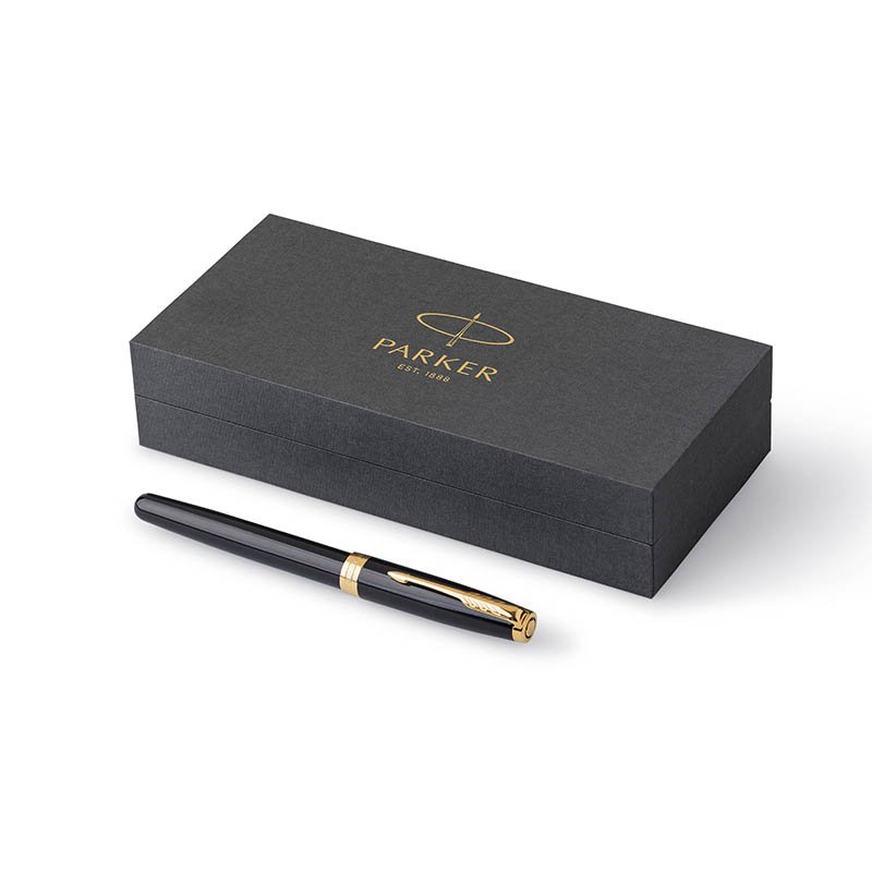 Čierno lakované telo a vrchnák. V kombinácii s pozlátenými doplnkami. Hrot z nehrdzavejúcej ocele s krížovou rytinou, pokovaný zlatom. Plniace pero: nasadzovací vrchnák standardní konvertor s piestom pre plnenie pera atramentom Quink z fľaštičky možnosť používať i atramentové bombičky Quink Vyrobené vo Francúzsku. Dodávané s 2 čiernymi bombičkami, v elegantnom darčekovom balení. Ako sa líšia hroty M a F? F - Slabý hrot (Fine) - Vhodný pre bežné písanie a poznámky. Mierny tlak vytvára jemnú linku. Veľmi obľúbený, vhodný pre užívateľov so štandardným rukopisom. M - Stredný hrot (Medium) - Priemerný tlak a šírka linky. Vhodný pre užívateľov, ktorí majú radi trochu silnejšiu linku. Hroty Parker