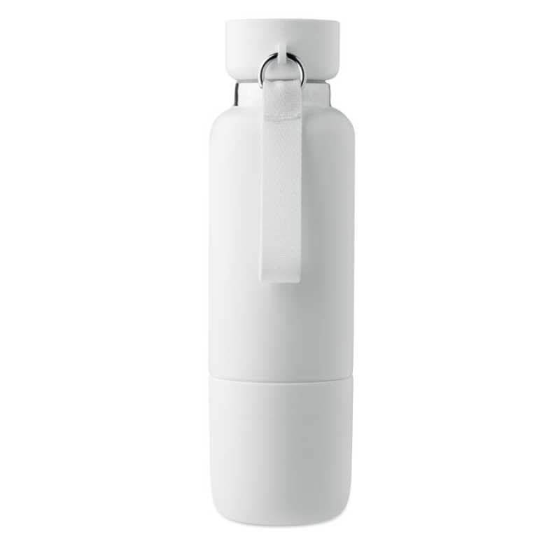 Dvoustěnná láhev z 90 % recyklované nerezové oceli a 10 % nerezové oceli, s integrovaným poutkem a dalším dlouhým páskem (70 cm) ve víčku z PP. Kelímek ve spodní části lahve. Objem 500 ml.