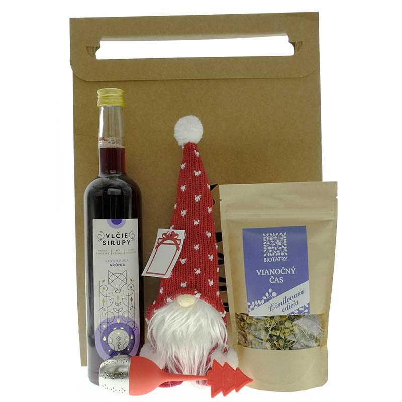Darčeková taška stredná > prírodná > 40x28x10 cm, Vianočný čas 30 g, Sirup levanduľa – arónia 500 ml, Vianočný škriatok > červená, Sitko na čaj > červená