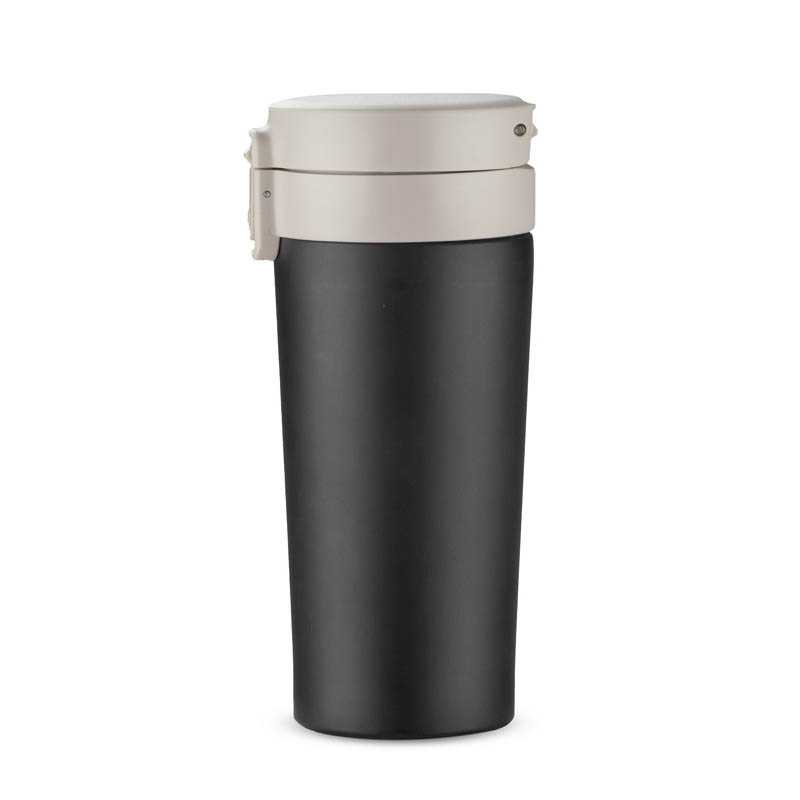 Termohrnček s objemom 500 ml s dvojitou stenou z vylepšenej nerezovej ocele 18/8 a pogumovaným dnom, netečúci. Vákuum medzi 2 stenami poskytuje hrnčeku dokonalé tepelno izolačné vlastnosti. Otváranie na tlačidlo a poistku zaisťuje dvojitú ochranu proti ne