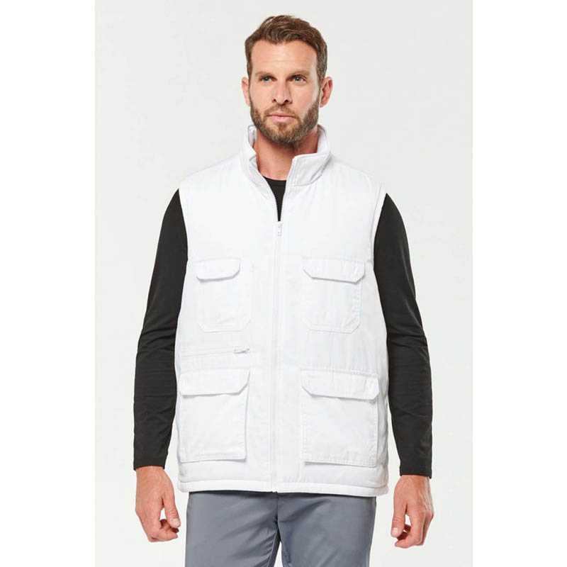 Two-Tone Padded Multi-Pocket Work Vest. Made of a sturdy cotton twill fabric blended with polyester outer fabric for strength and durability, smooth inner lining and inner quilting for ensuring excellent thermal insulation. Stand-up collar with full-zip flap and snap matching button front closure, which provides warmth and comfort. Elasticated waistband and armholes for a secure and comfortable fit, adjustable waist with side button fastening for a better fit, a tailpiece that covers the lumbar zone for added comfort and also provides a large printing area.Two lower gusseted pockets, two side pockets, two upper pockets (with a zip on the left for easy customization), three pen holders, a small accessory pocket and an inner velcro pocket, for a secure and convenient storage. Includes an inside back zip for easy marking with different methods: screen printing, embroidery, transfer printing, badges, shields, vinyl application. Ideal as workwear and uniforms, this Vest matches all THUNDER line items (sweatshirt, trousers, T-shirt, polo shirts, fleece jacket, and softshell jacket).
