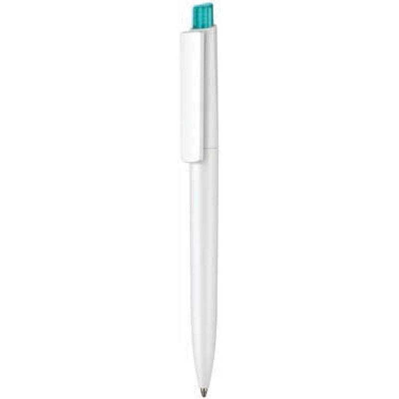 Stilolinea plastic ballpen with a white barrel, coloured accents. metal clip, and jumbo refill. Blue ink. Orderable per 1,000 pieces.