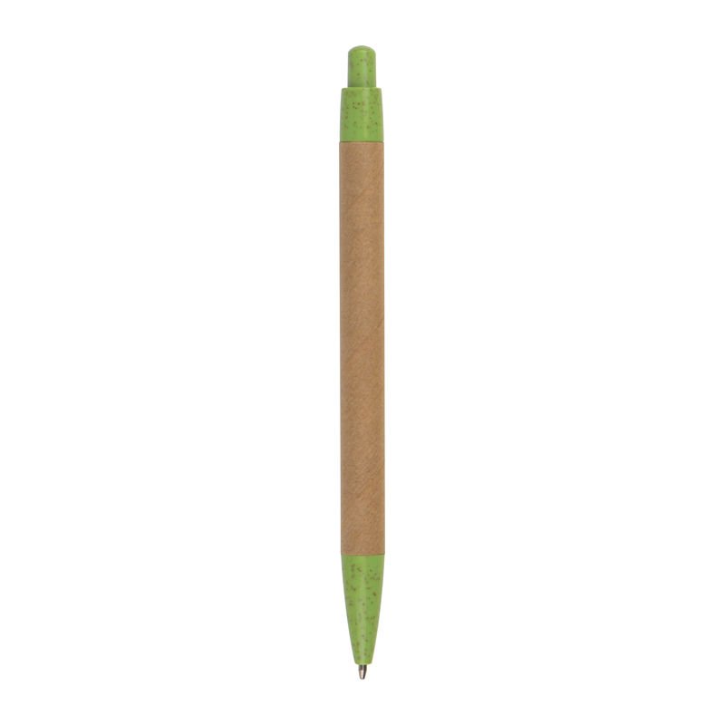 Ekologické guľôčkové pero s telom z recyklovaného kartónového papiera, s modrou náplňou. Všetky časti sú vyrobené z plastu s obsahom pšeničnej slamy.
