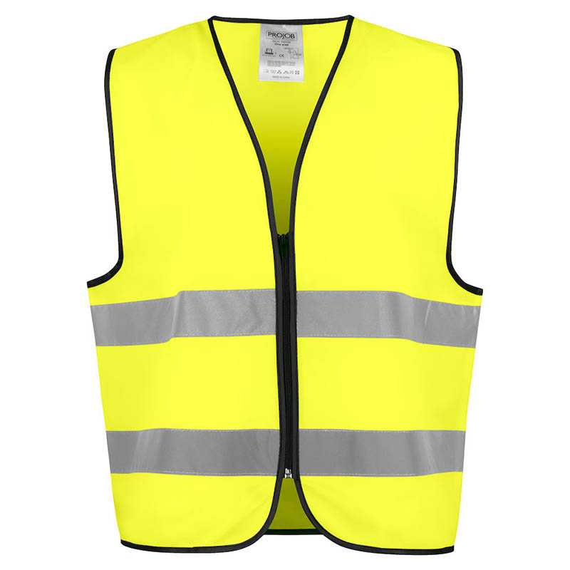 Vest with zipper closure at front. Adjustable width with drawstring at back. Side pockets and one smaller breast pocket (telephone pocket). Max 20 washes at 40oC. Material: 100% polyester Safety class: EN471-CLASS 3 Colour: ProJob yellow-10, orange-17 Size: ONE SIZE