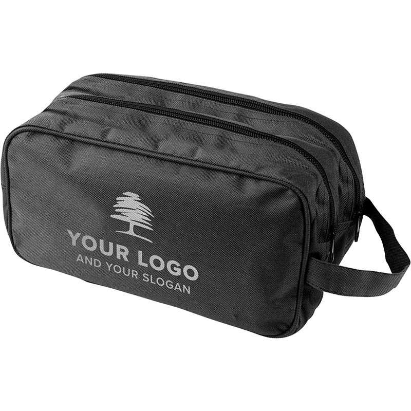 Polyester (600D) toilet bag with two zippered compartments and carrying strap.
